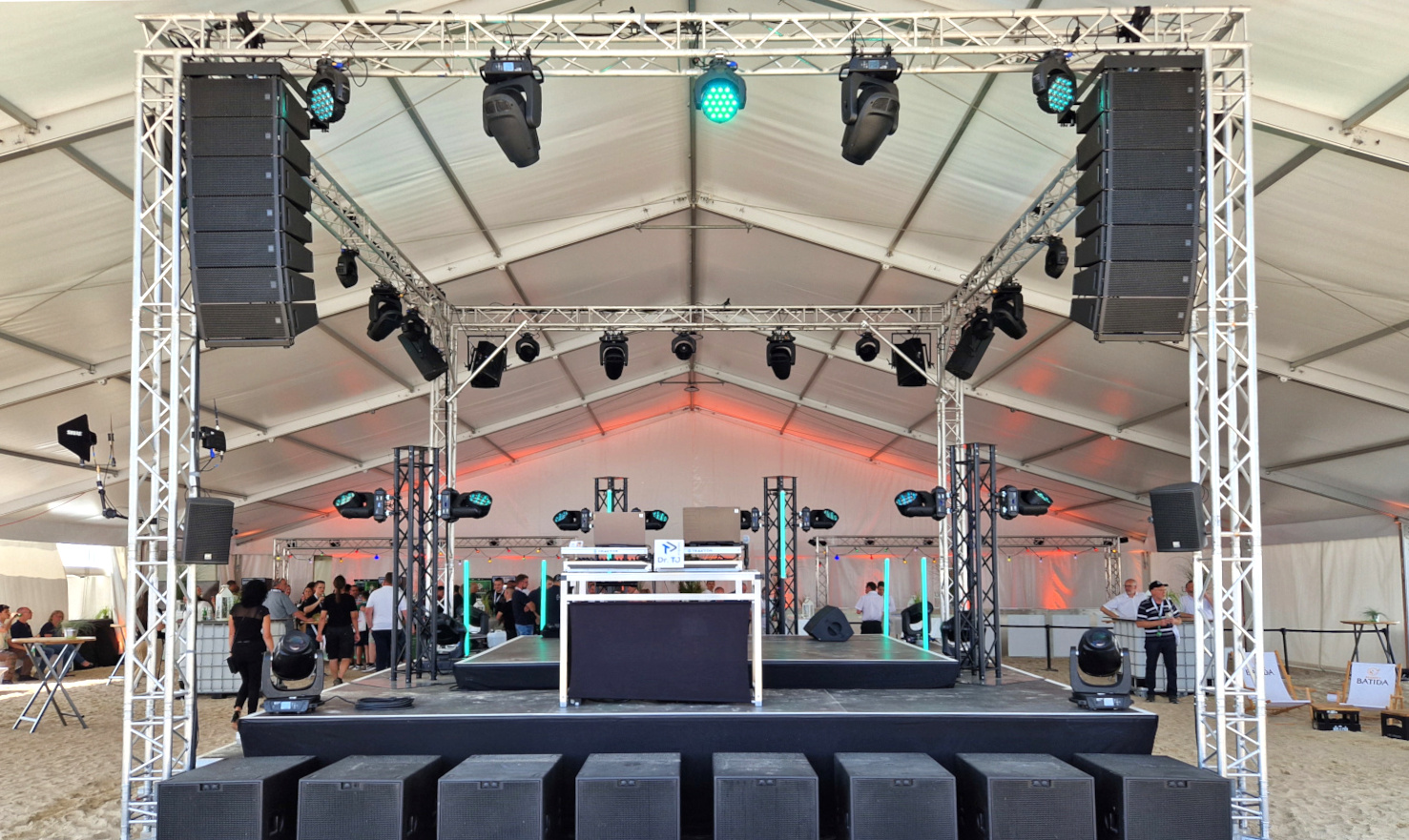 Dank moderner und größtenteils akkubetriebener LED-Technik kann der Raum optimal einbezogen werden, ohne dabei größeren Verkabelungsaufwand zu erfordern. Dies ermöglicht eine flexible Gestaltung der Beleuchtungstechnik, um eine ästhetisch ansprechende und technisch durchdachte Illumination für Ihr Event zu schaffen.